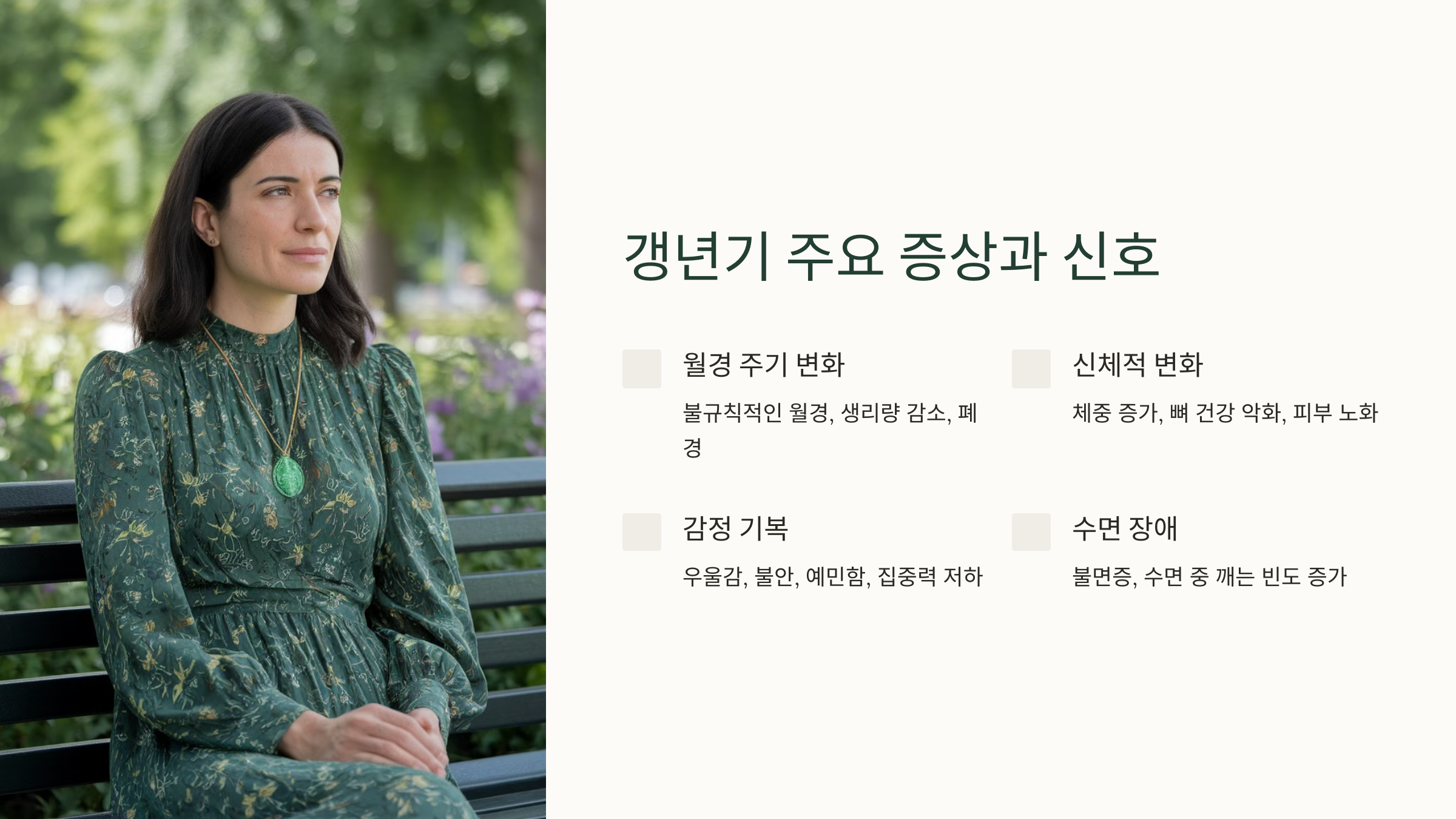 🔸 우울감과 감정 기복: 기분 변화가 심해지고, 이유 없이 우울하거나 짜증이 날 때가 많아요.