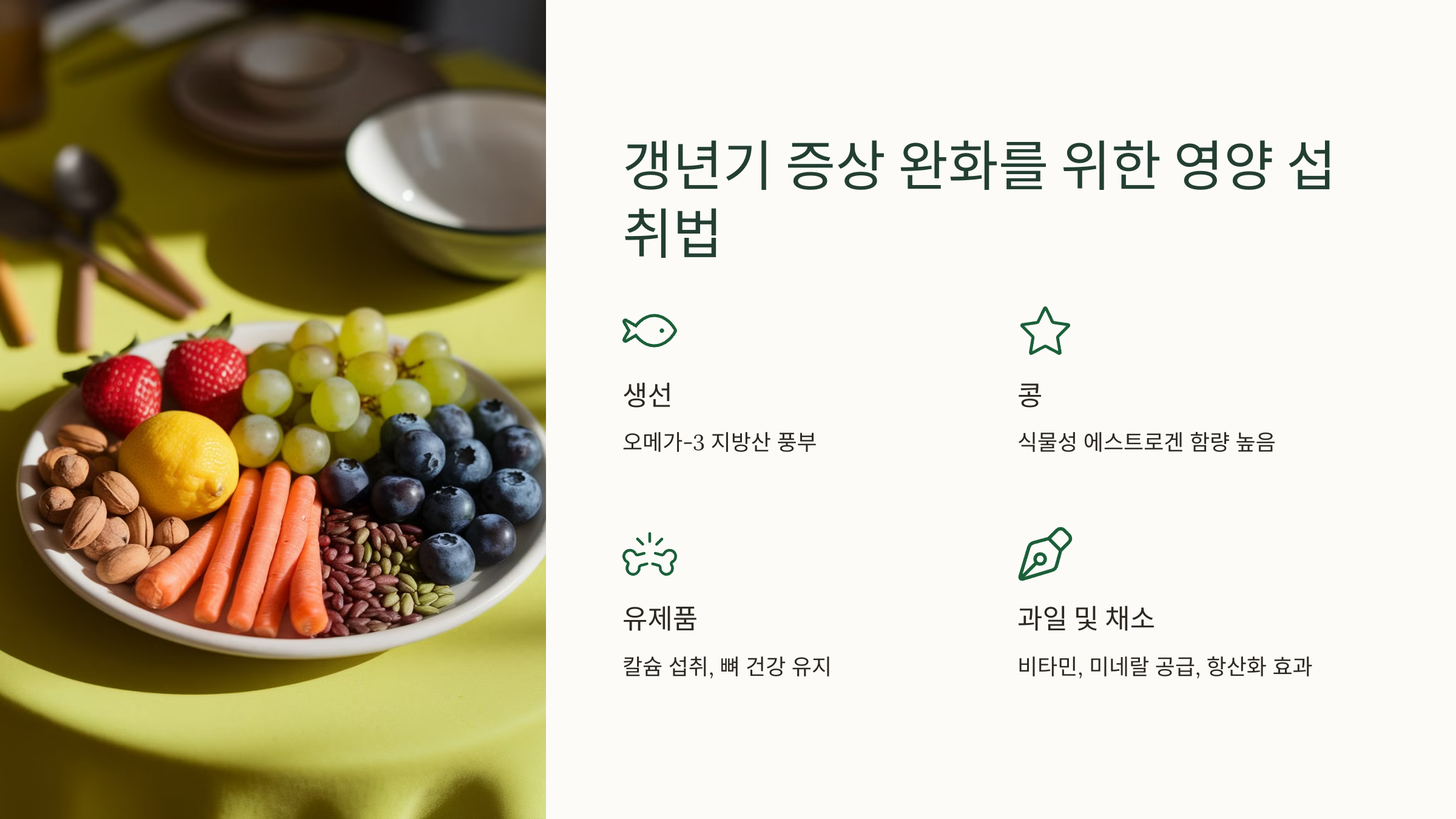이처럼 균형 잡힌 식단을 유지하면 갱년기 증상을 완화할 수 있어요!
