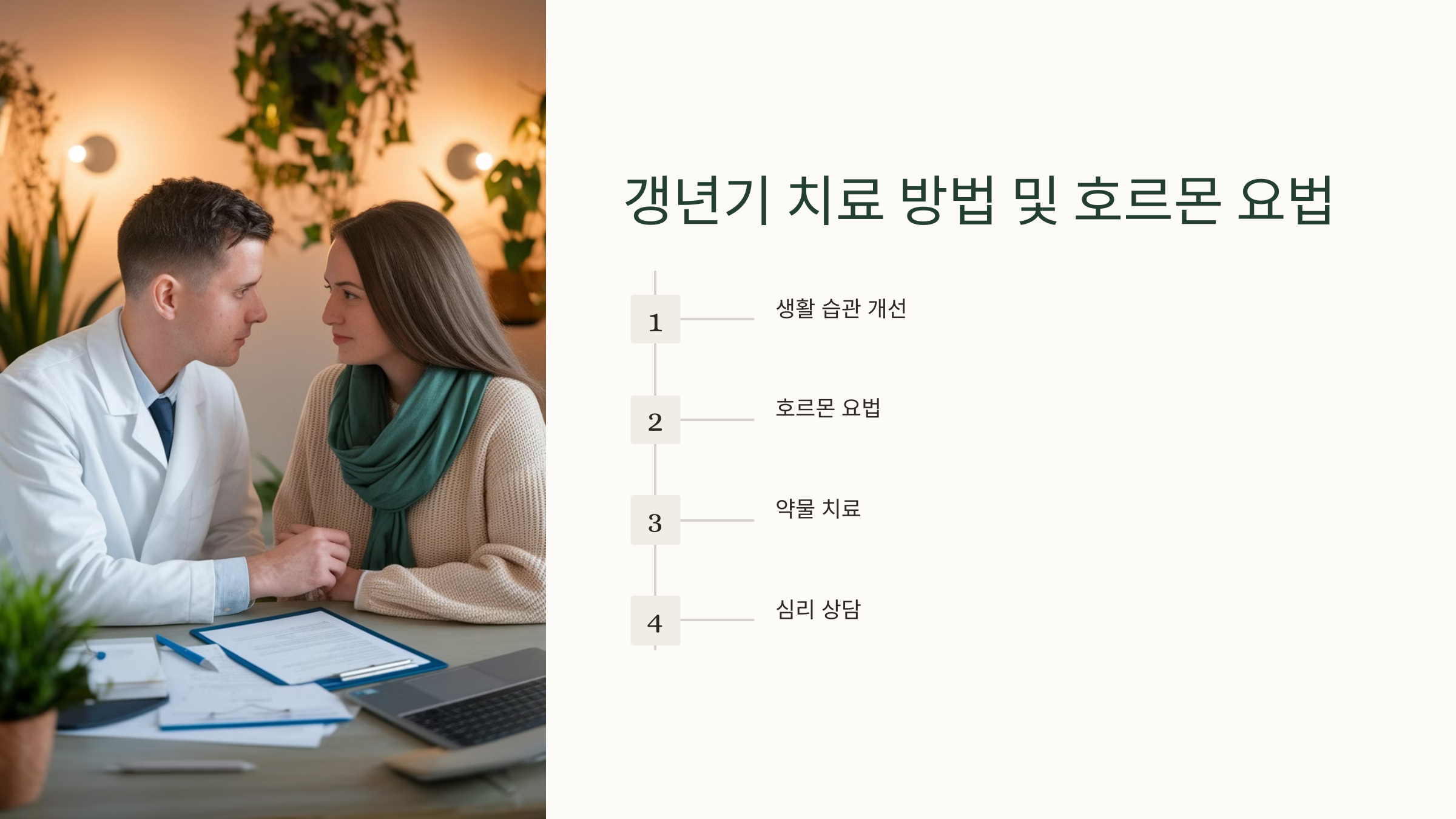갱년기 증상이 심할 경우 치료를 고려해 볼 수 있어요. 다양한 방법이 있지만, 가장 효과적인 치료법 중 하나가 바로 호르몬 요법이에요.
