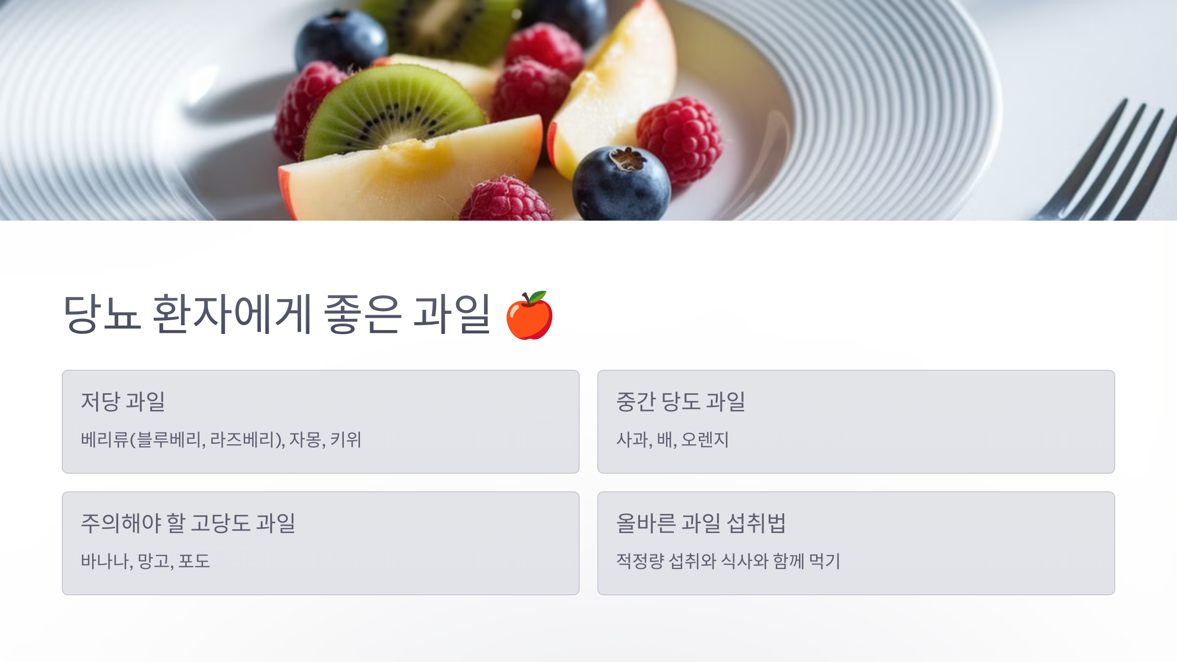 과일에는 자연적인 당(프룩토오스)이 포함되어 있어요. 하지만 모든 과일이 혈당을 급격히 올리는 것은 아니랍니다. 혈당 지수(GI)가 낮고 식이섬유가 풍부한 과일을 선택하면 당뇨 관리에 도움을 줄 수 있어요! 😊