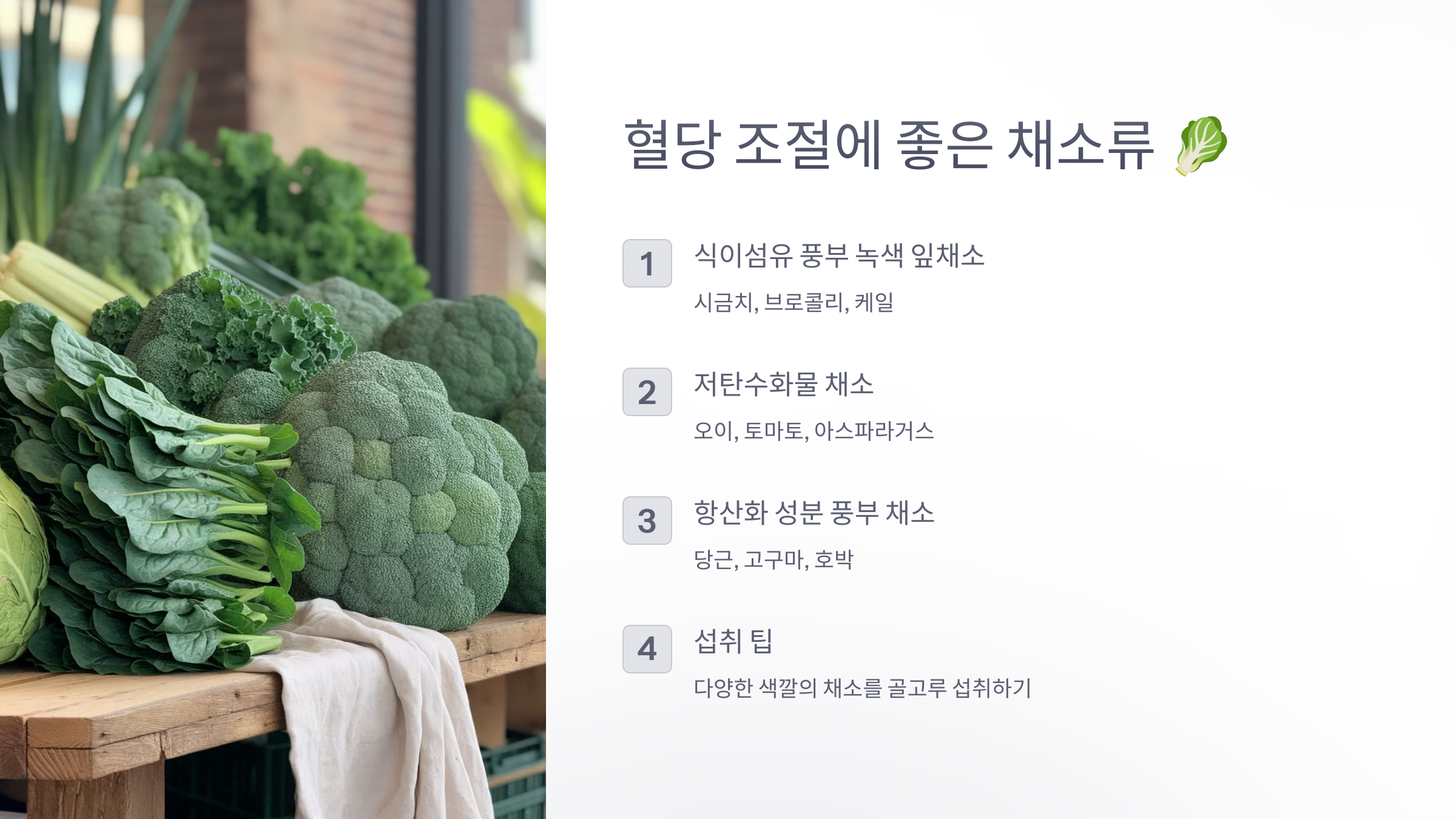 당뇨 환자에게 채소는 필수 식품이에요! 특히 녹색 잎채소와 저탄수화물 채소는 혈당을 급격히 올리지 않으면서도 풍부한 영양소를 제공해줘요.