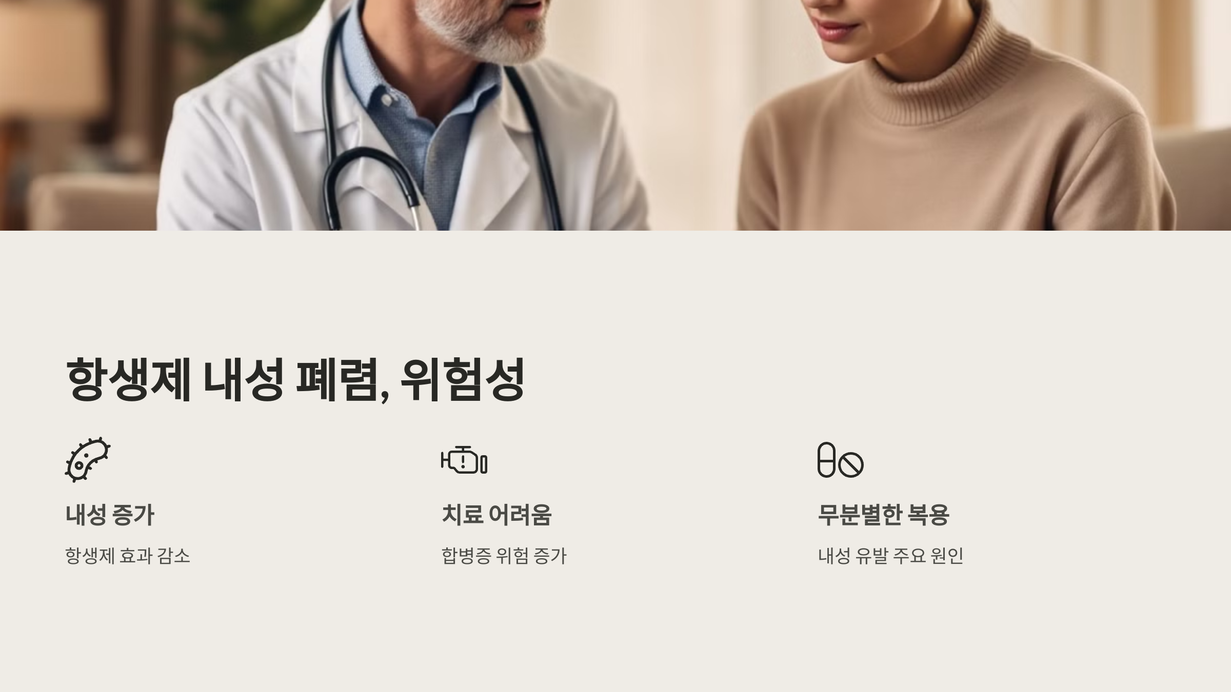 항생제 내성이 생기면 기존 항생제가 듣지 않는 강력한 세균 감염이 발생할 위험이 커져요. 이런 경우 치료가 어려워지고, 입원 기간이 길어지며 심하면 사망 위험까지 증가할 수 있어요.