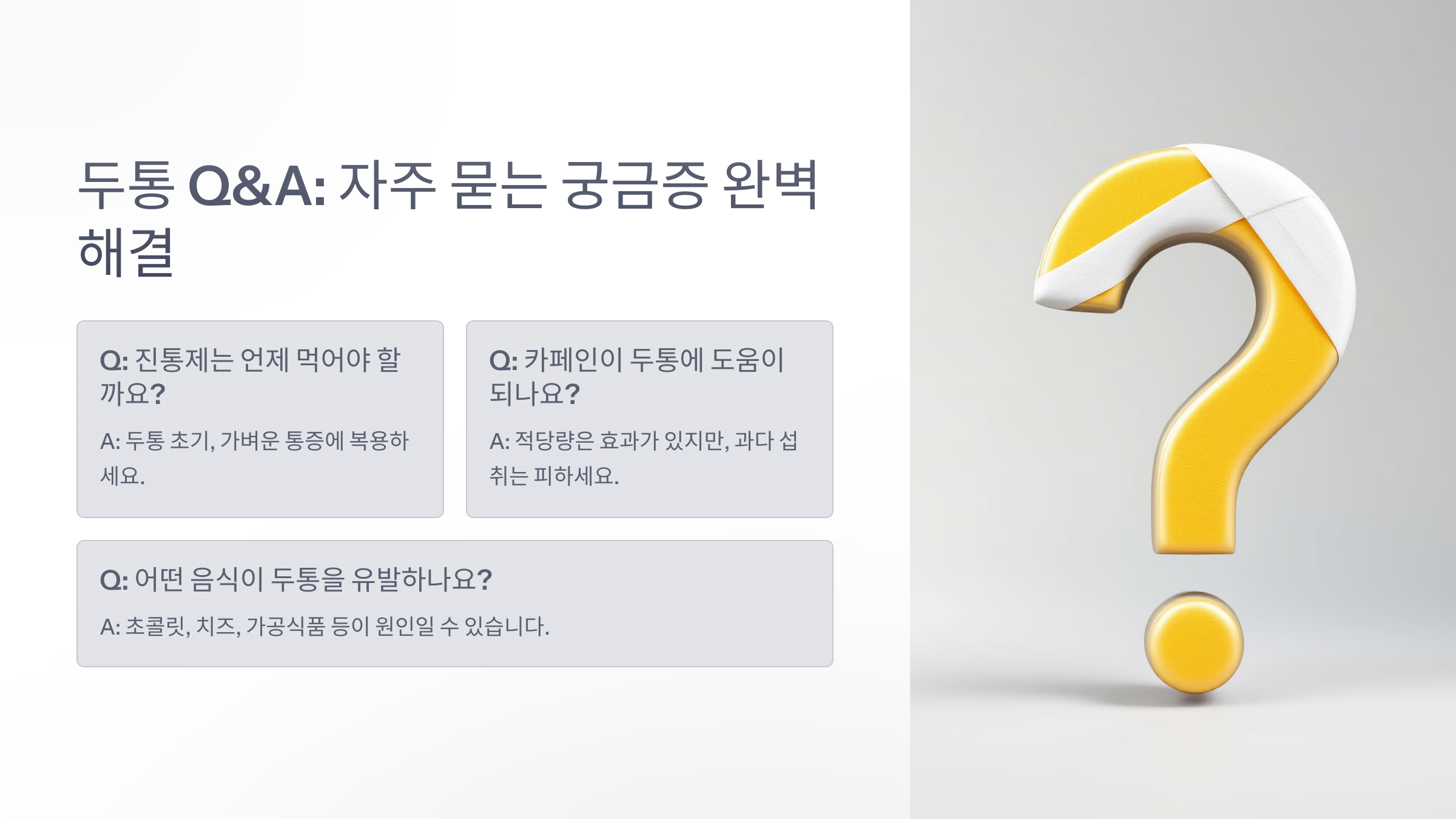 A1. 가벼운 두통이라면 **충분한 휴식, 수분 섭취, 마사지**로 완화하는 것이 좋아요. 하지만 두통이 심하거나 지속된다면 진통제를 복용하는 것도 방법이에요.