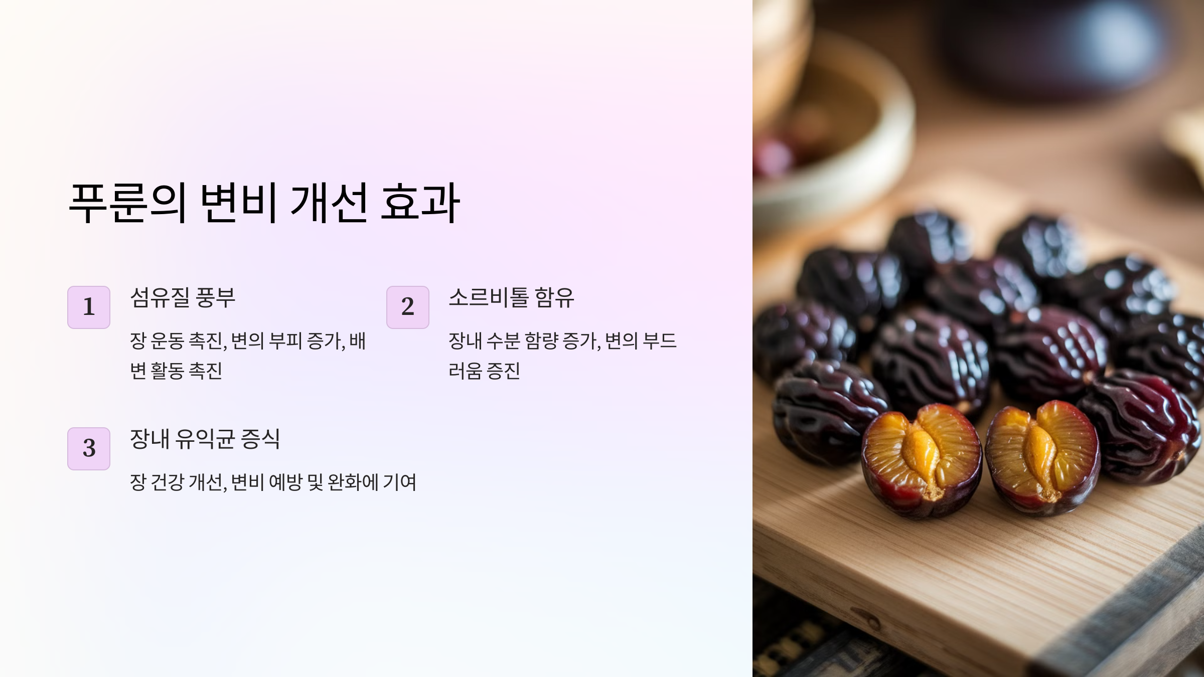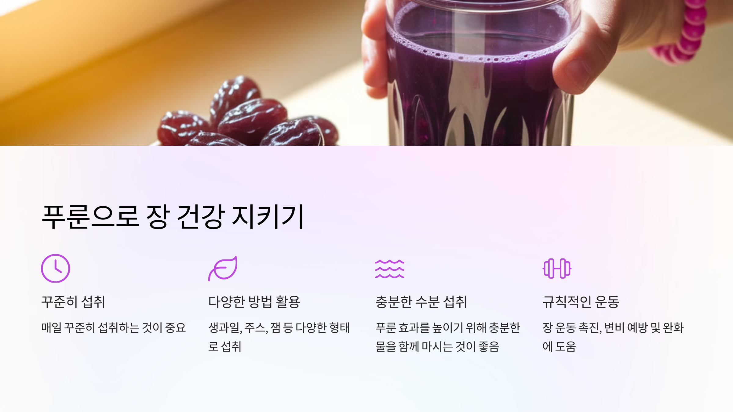 이처럼 푸룬은 단순히 대변을 부드럽게 만드는 것 이상으로, 장 건강을 전반적으로 향상시키는 데 중요한 역할을 해요. 아래에서 푸룬을 활용해 장 건강을 지키는 방법도 자세히 알려드릴게요!