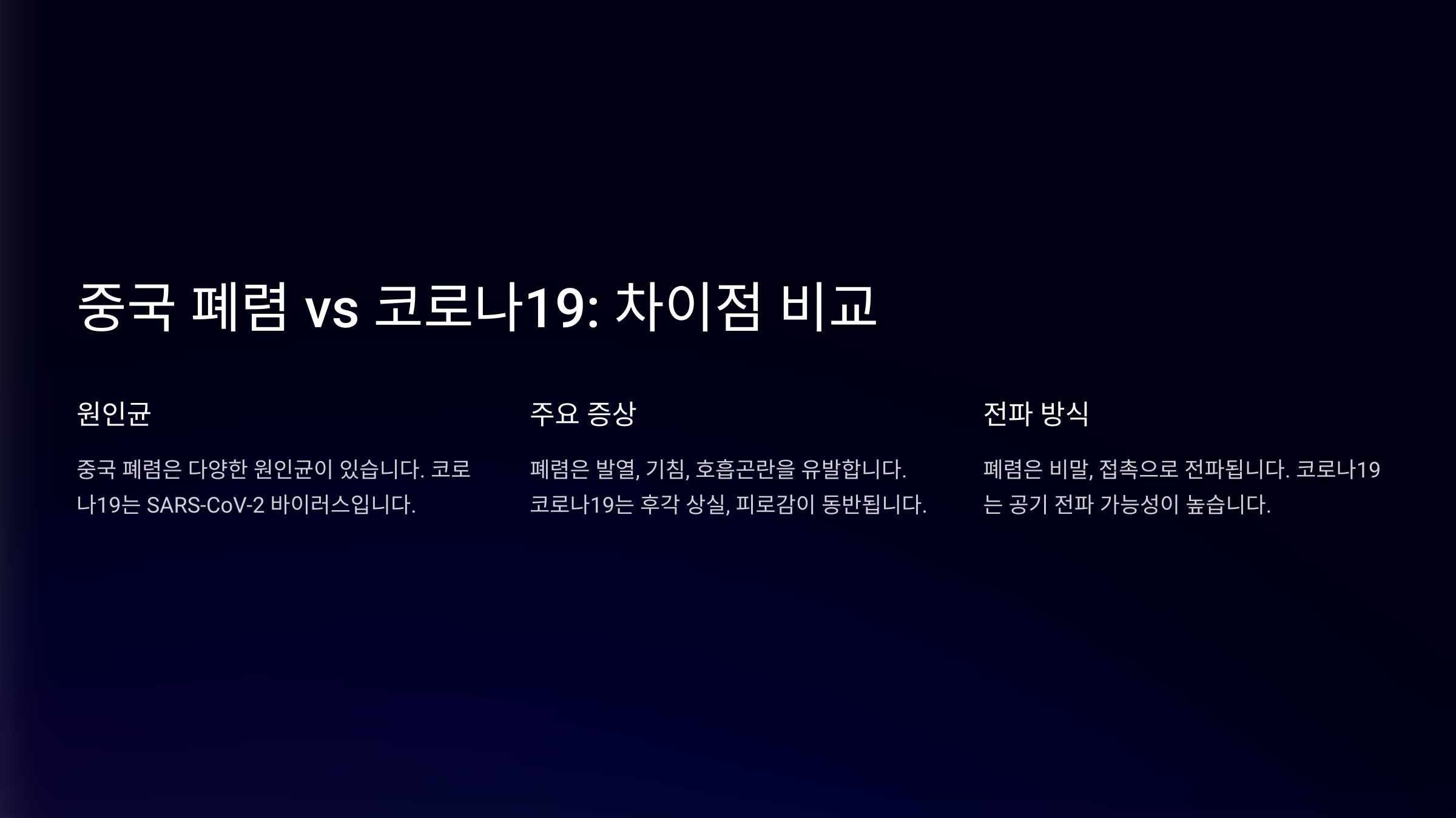 | 특징 | 코로나19 | 중국 폐렴 |
