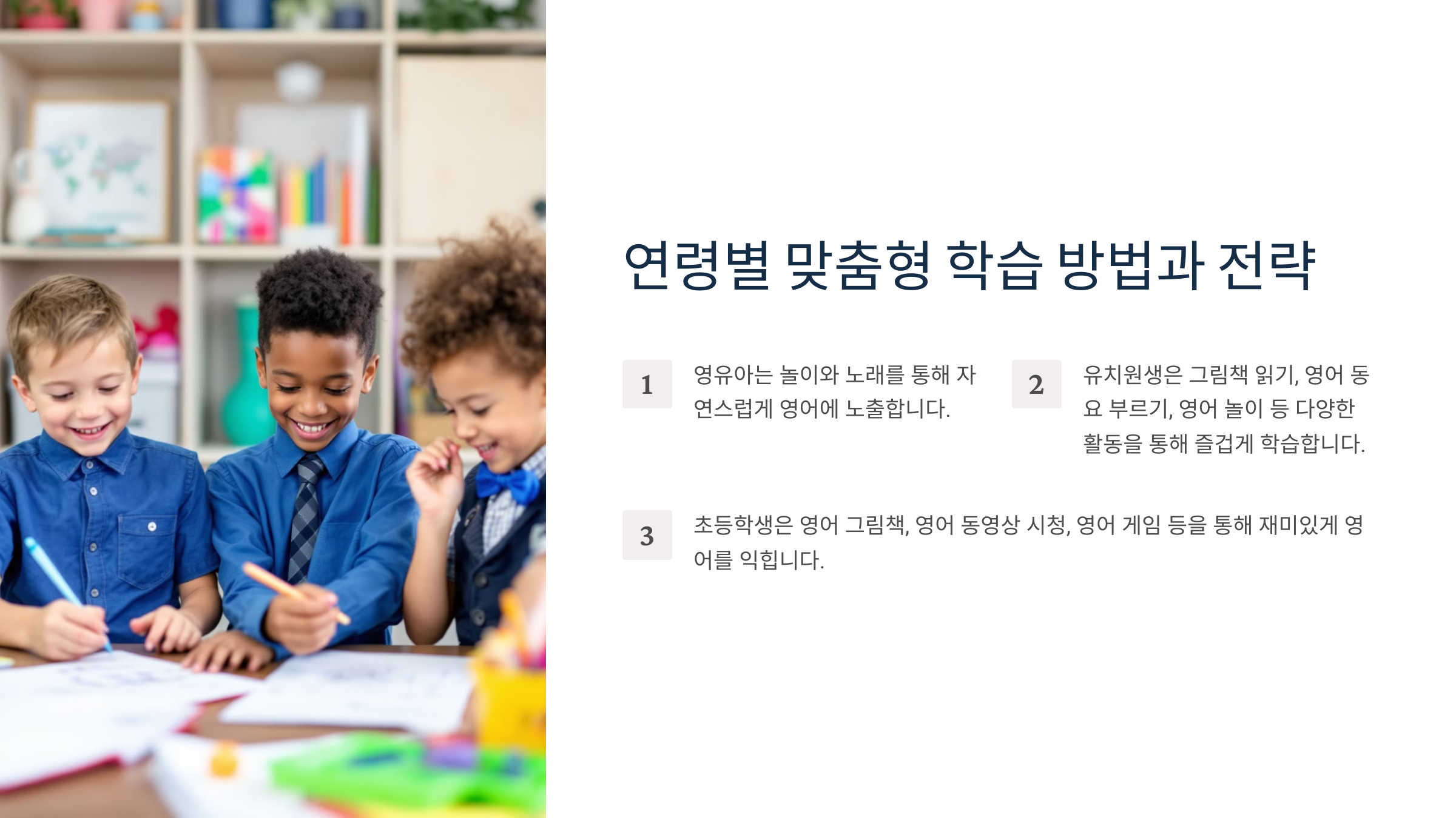 | 자연스러운 학습 | 아이의 일상 속에서 영어를 접할 수 있음 |