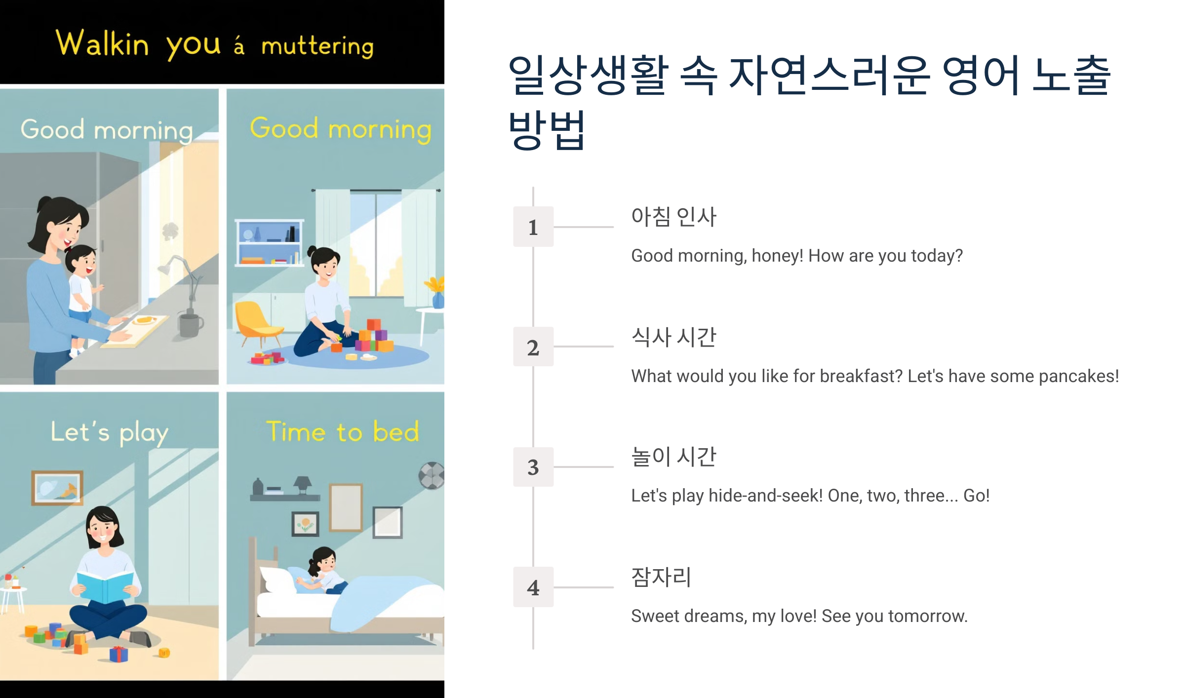 엄마표 유아영어를 성공적으로 진행하려면, 아이가 영어를 부담 없이 자연스럽게 접할 수 있도록 도와주는 것이 중요해요. 여기서 핵심은 ‘일상 속 노출’이에요! 📚