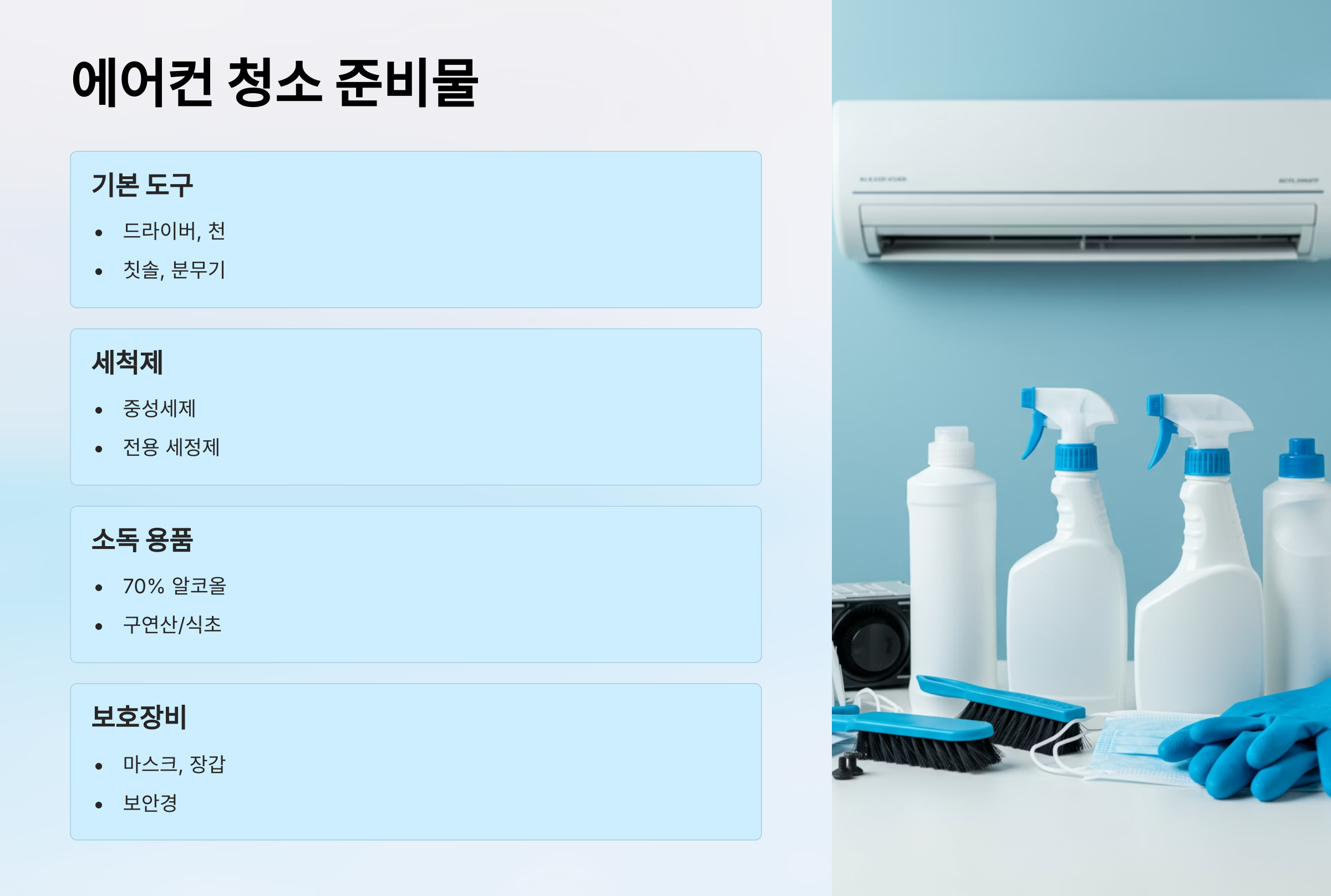 에어컨 청소를 하려면 몇 가지 기본 준비물이 필요해요. 가장 먼저 준비해야 할 것은 먼지 청소 도구와 물청소용 스프레이, 그리고 세정제예요. 에어컨 전용 세정제는 곰팡이와 먼지를 깨끗하게 없애줄 뿐만 아니라 살균효과도 있어서 꼭 필요하답니다. 🧽