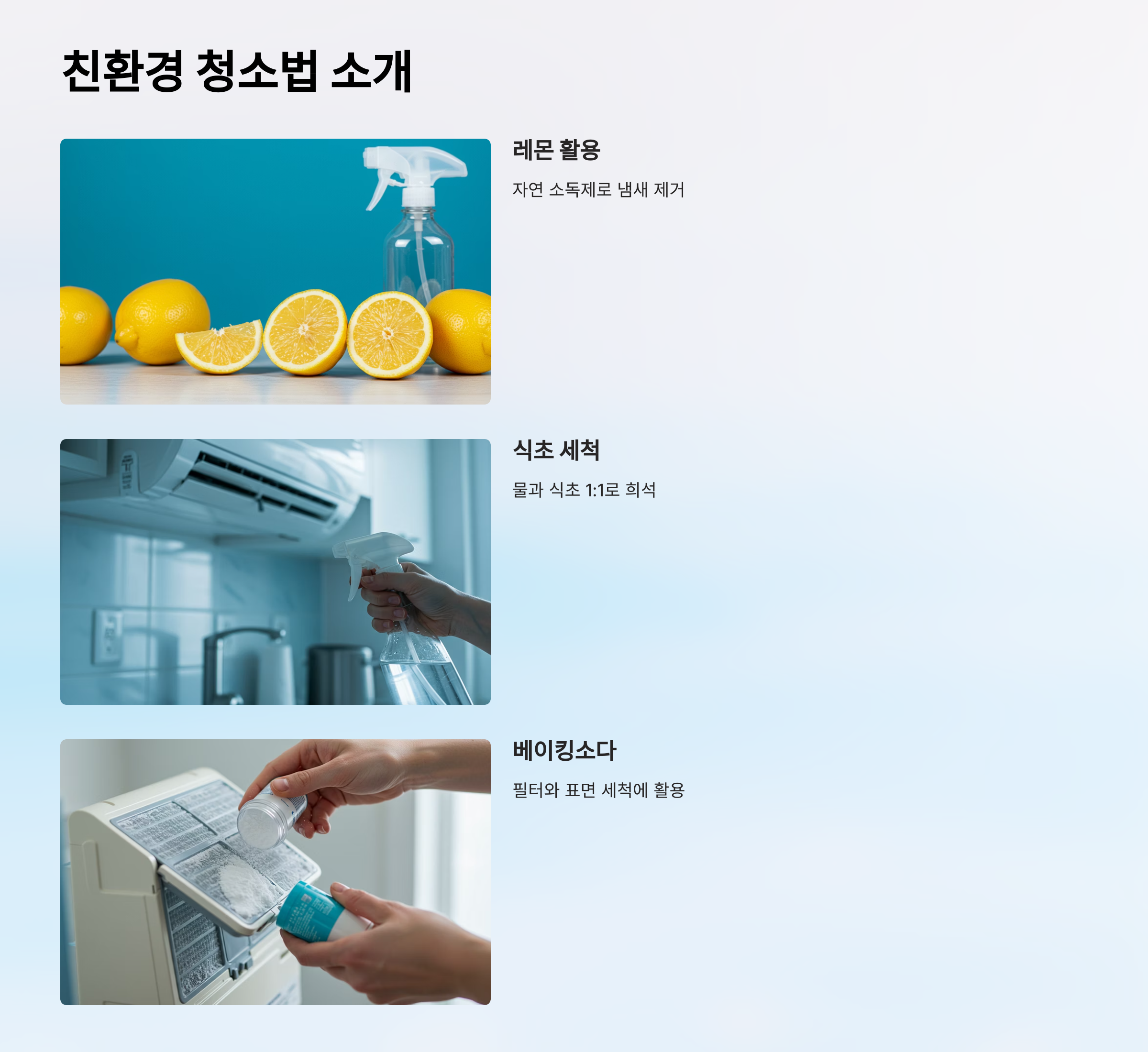 에어컨 청소는 환경에도 신경 쓰면 좋아요. 요즘은 친환경 세정제를 사용해서 화학 성분 걱정 없이 청소할 수 있답니다. 베이킹소다나 구연산은 대표적인 친환경 세정제예요. 😉