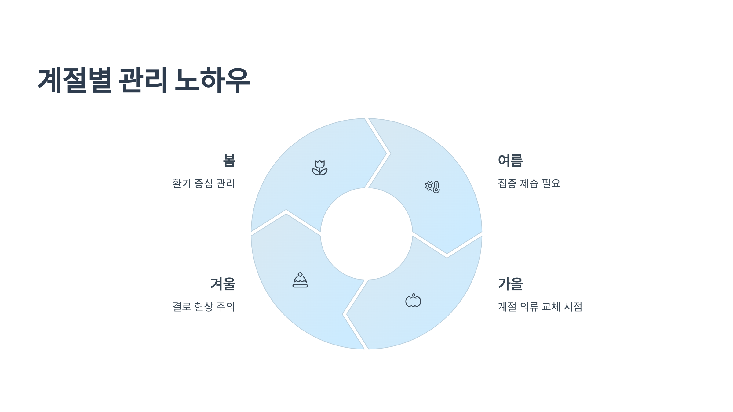 겨울철에는 상대적으로 습기 관리가 쉬워지지만 난방으로 인한 온도차 문제가 발생할 수 있어요. 특히 외벽에 인접한 옷장은 결로 현상이 생기기 쉬워서 단열재 보강이나 공간 확보가 필요해요. 가습기를 과도하게 사용하면 실내 습도가 높아져서 옷장에도 영향을 줄 수 있으니까 적정 습도를 유지해야 해요. 겨울 의류는 두껍고 부피가 커서 공기 순환이 어려우니까 의류 간격을 충분히 두고 정기적으로 위치를 바꿔주는 것이 좋아요. 이 시기에는 제습제 교체 주기가 길어지지만 완전히 소홀히 하면 안 되고 한 달에 한 번 정도는 점검해주세요. 연말에는 1년간의 관리 상태를 점검하고 다음 해 계획을 세우는 것이 좋습니다.
