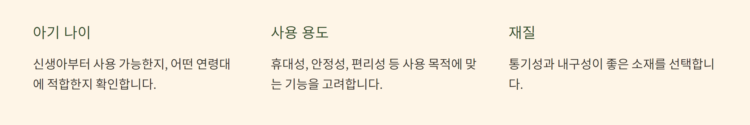 세 번째는 아기의 성장에 따라 조절 가능한 디자인이에요. 신생아부터 유아기까지 사용하려면 크기 조절이 용이한 제품을 선택해야 해요. 또한, 아기 피부에 닿는 소재가 부드럽고 자극적이지 않은지도 꼭 확인해야 해요.