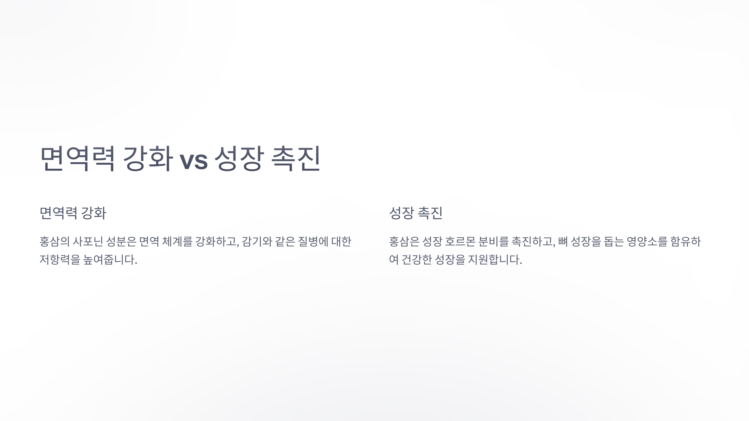 | 홍삼만 의존 | 다양한 영양소와 함께 섭취하는 것이 중요 |